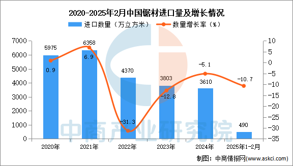 中商谍报网讯:据中商财产研究院数据库显示,同比下降5。1%。2025年1-2月中国原木进口量490万立方米,同比下降10。7%。
