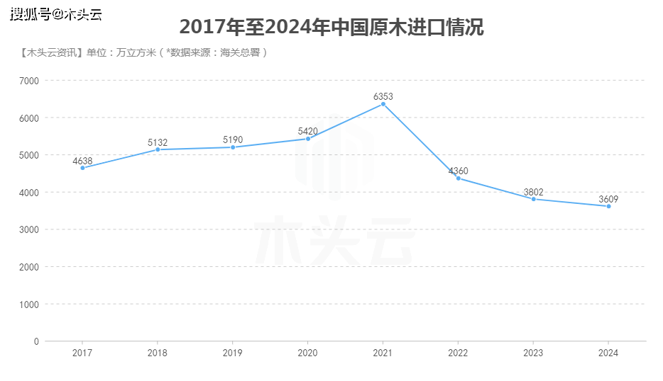 2024年,这一数字标记着近八年来的最低记实,取2023年比拟下降了5%。冷杉和云杉原木的进口量显著缩减,同比削减267万立方米,降幅高达46%。自2022年起,中国原木进口量持续三年呈现负增加态势,年均降幅别离为31。4%、12。8%和5%。同时,自2022年6月见顶至2024年12月,跌幅达到24。8%。