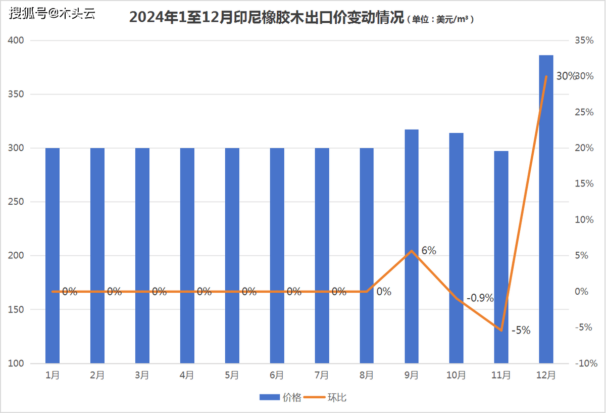 2024年印尼分析欢出口价表示较为波动,最低价呈现正在3月,环比下井27%至400美元/立方;最高价呈现正在12月,环比增加13%至609美元/立方。其余月份,如1月环比2023年12月增加了10%;6月以及11月均环比增加20%。